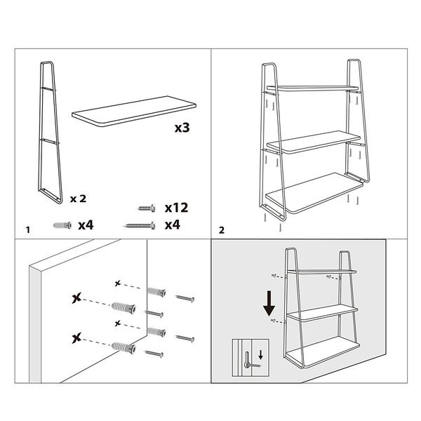 3-Tier Ladder Display Wall Shelf. It comes in espresso and white finish with 3-tiered ladder design that elegantly displays your favorite décor piece or holds books, collectibles, and framed photos. Functional yet stylish, the space-saving feature and minimal design make storage and decorating efficient and easy. The floating wall shelf is great for living room, bedroom, laundry room, and office. Unique hidden mounting design provides a stable and sturdy installation that tightly sits against the wall.