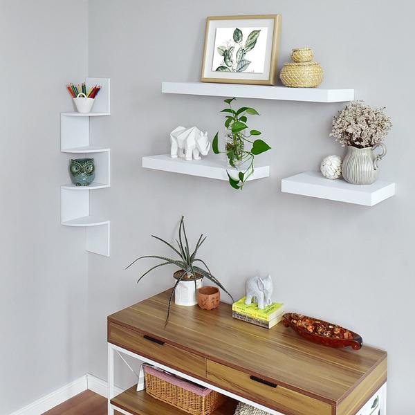 Zigzag Corner Wall Shelf makes space utilization possible from any corner it appears to float, attached to the wall by an unknown force. Use to organize books or display pictures and family artifacts. The walnut color fit for any living decor.